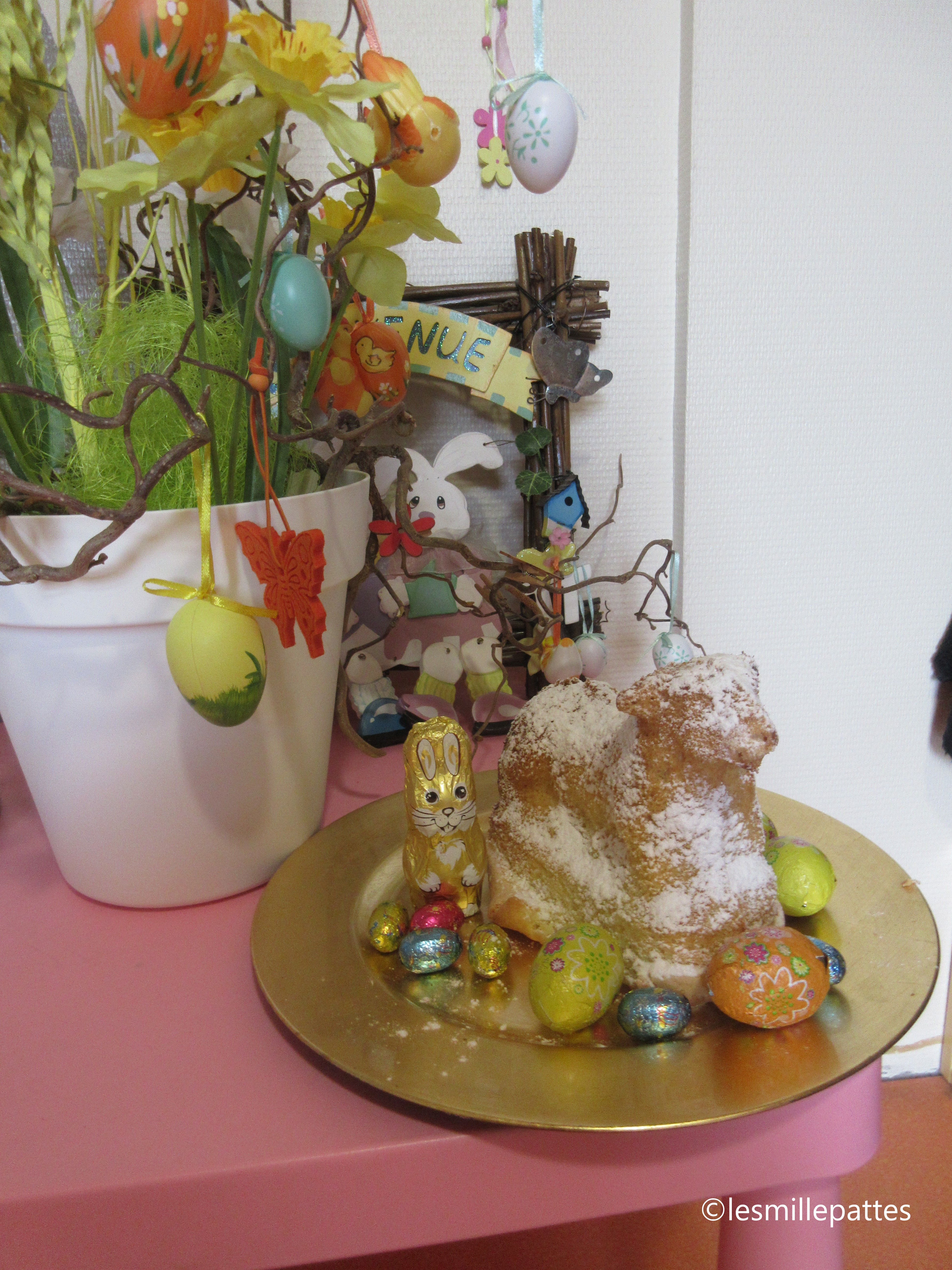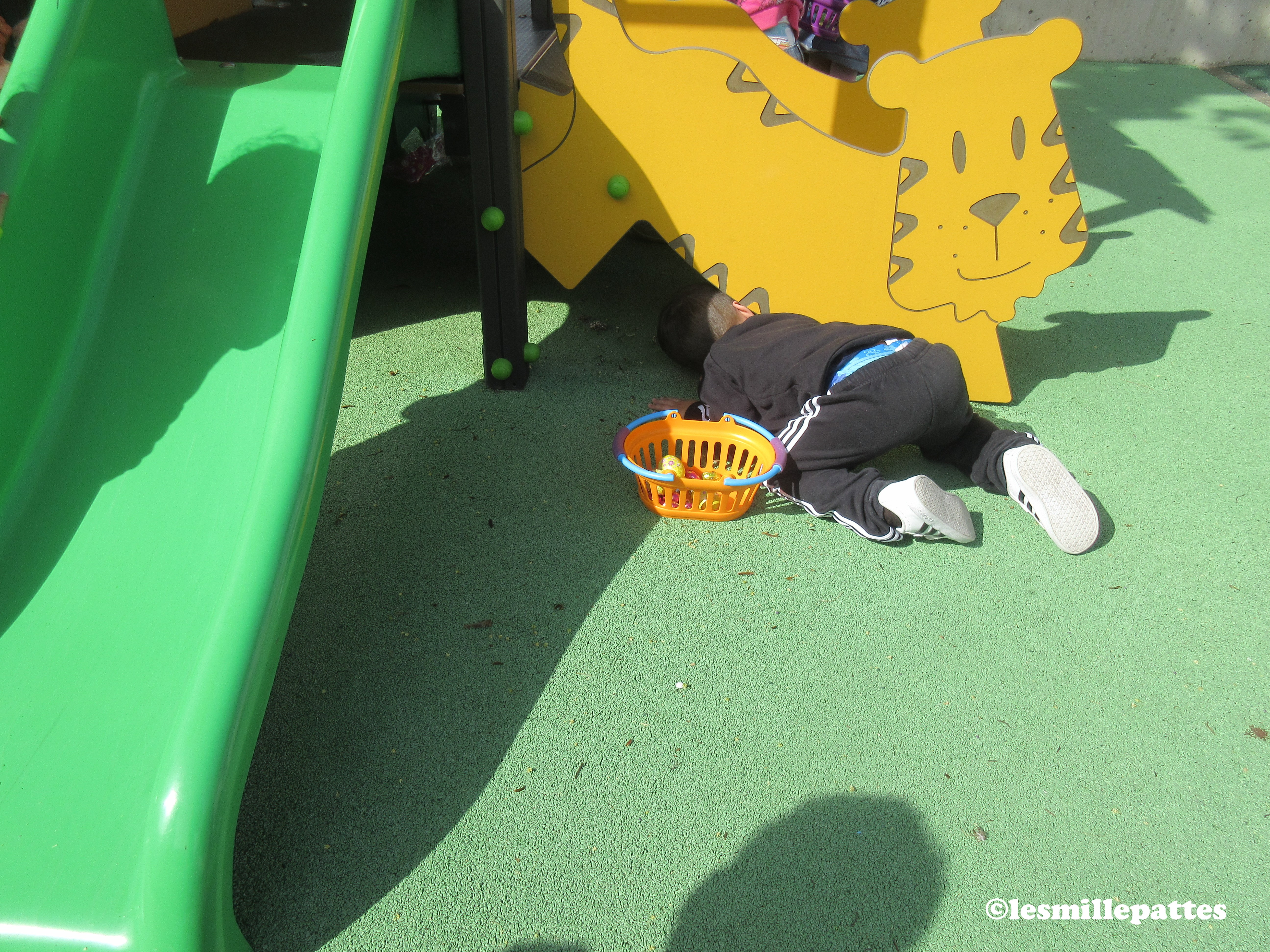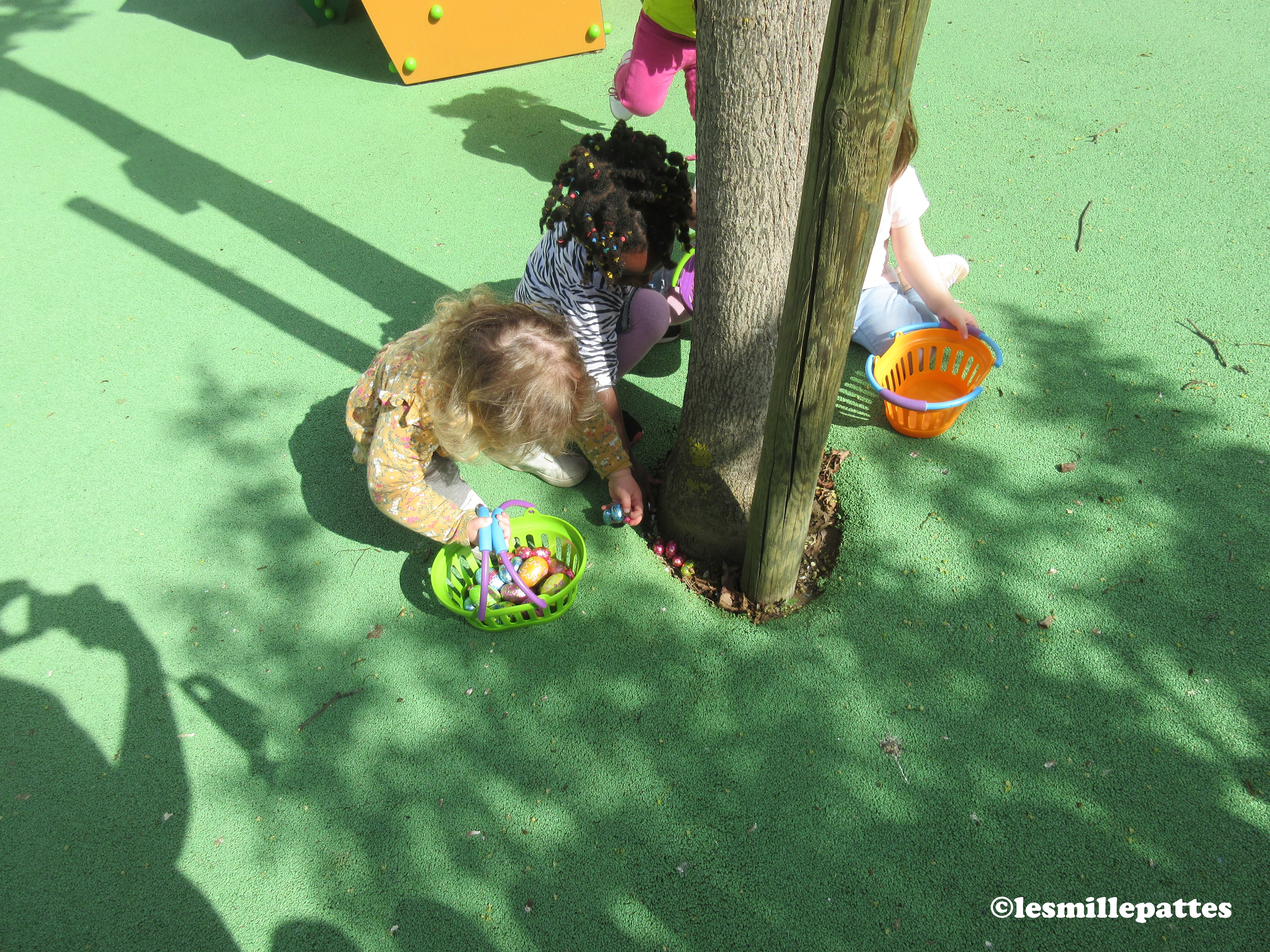 Le matin, nous avons confectionné les fameux Lamalas, et l’après-midi, après que le lapin soit passé, c’était chasse aux œufs ! On a même vu le bout du nez du véritable lapin, et nous avons pu le caresser…